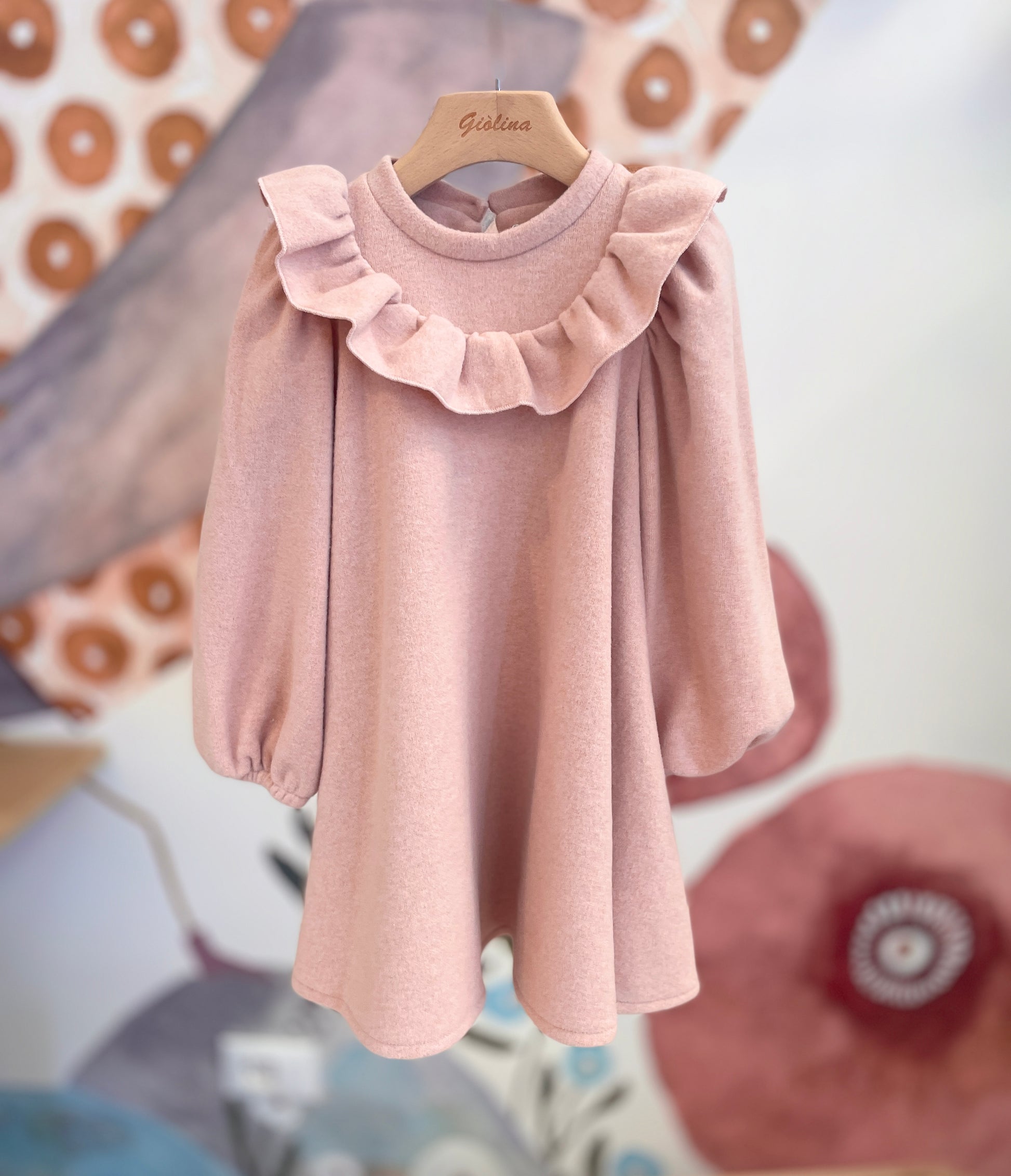 Abito a ruota in cotone caldo rosa con collo a petalo disponibile dalla 2 anni alla 4 anni . Da € 88 a € 96