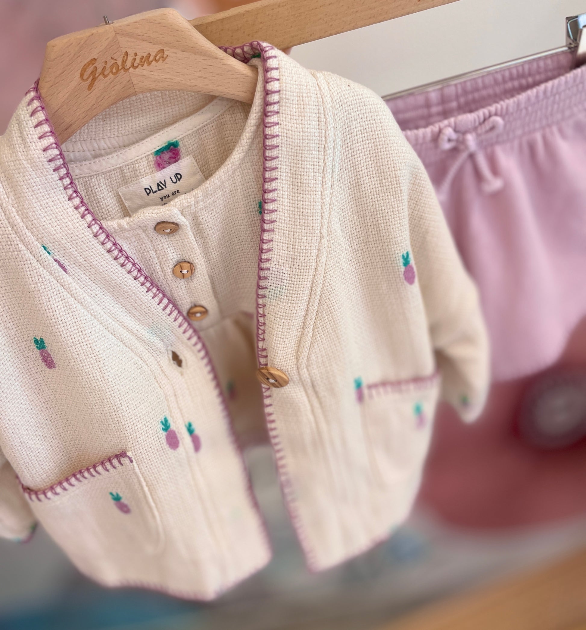 Kimono latte con stampa ananas con bottoncino in legno disponibile dalla 6 mesi alla 36 mesi . € 83