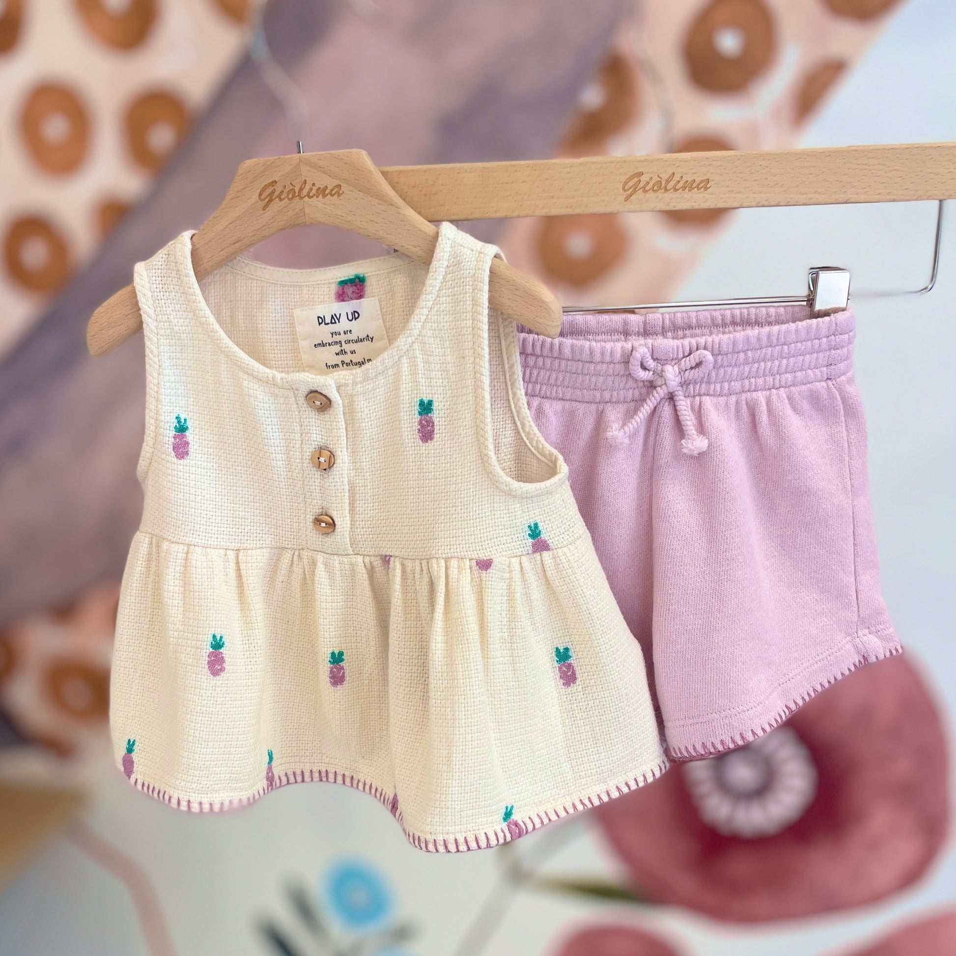Blusa smanicata con bottoncini in legno stampa ananas disponibile dalla 3 mesi alla 36 mesi . € 48