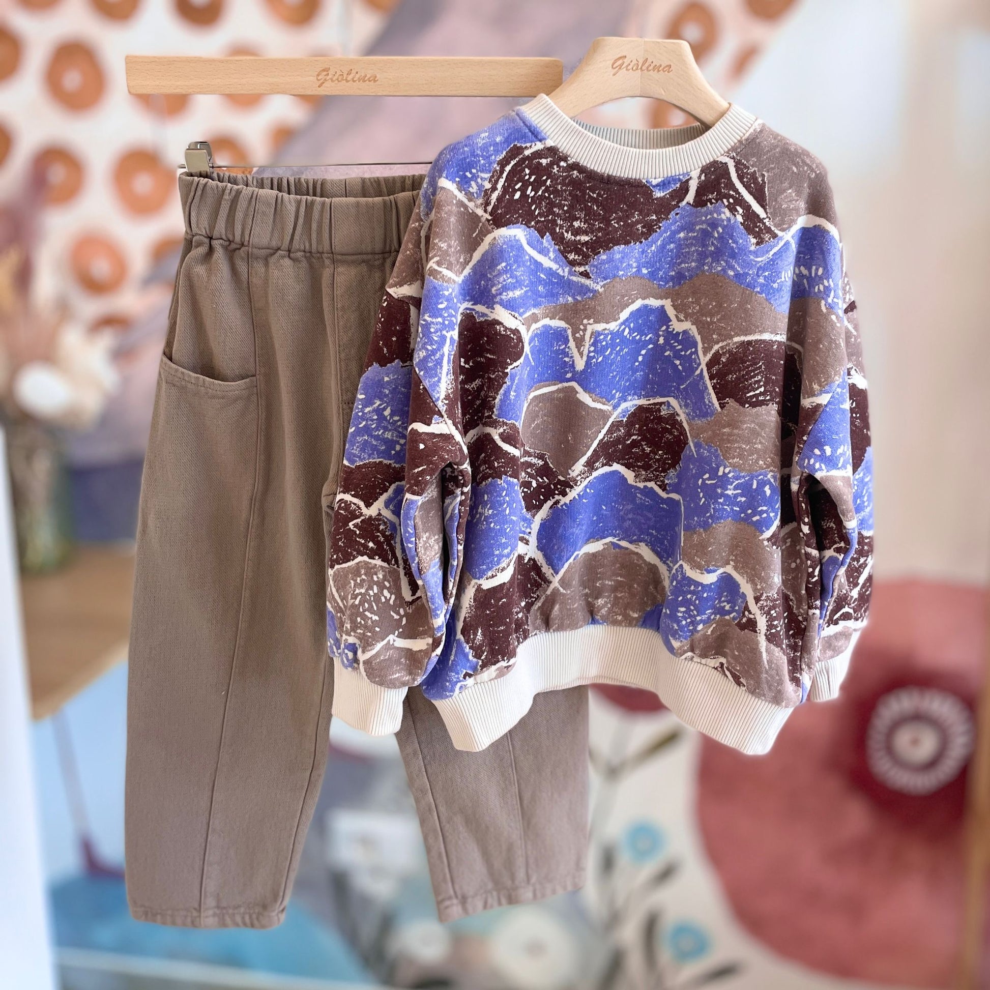 Felpa di cotone garzata azzurra e tortora stampa astratta disponibile dalla 4 anni alla 12 anni . € 58