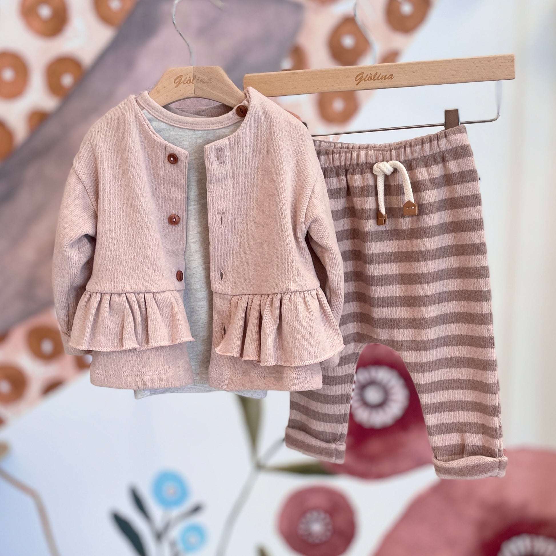 Cardigan rosa con bottoncini e balza disponibile dalla 9 mesi alla 4 anni . € 50