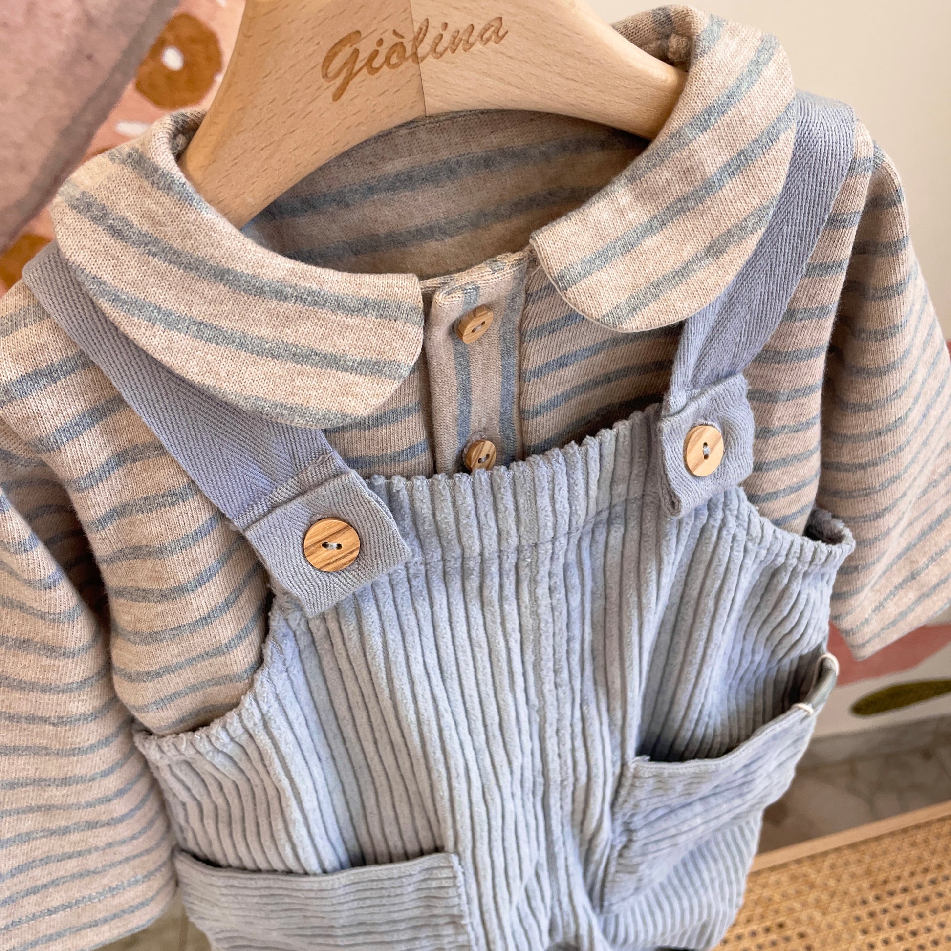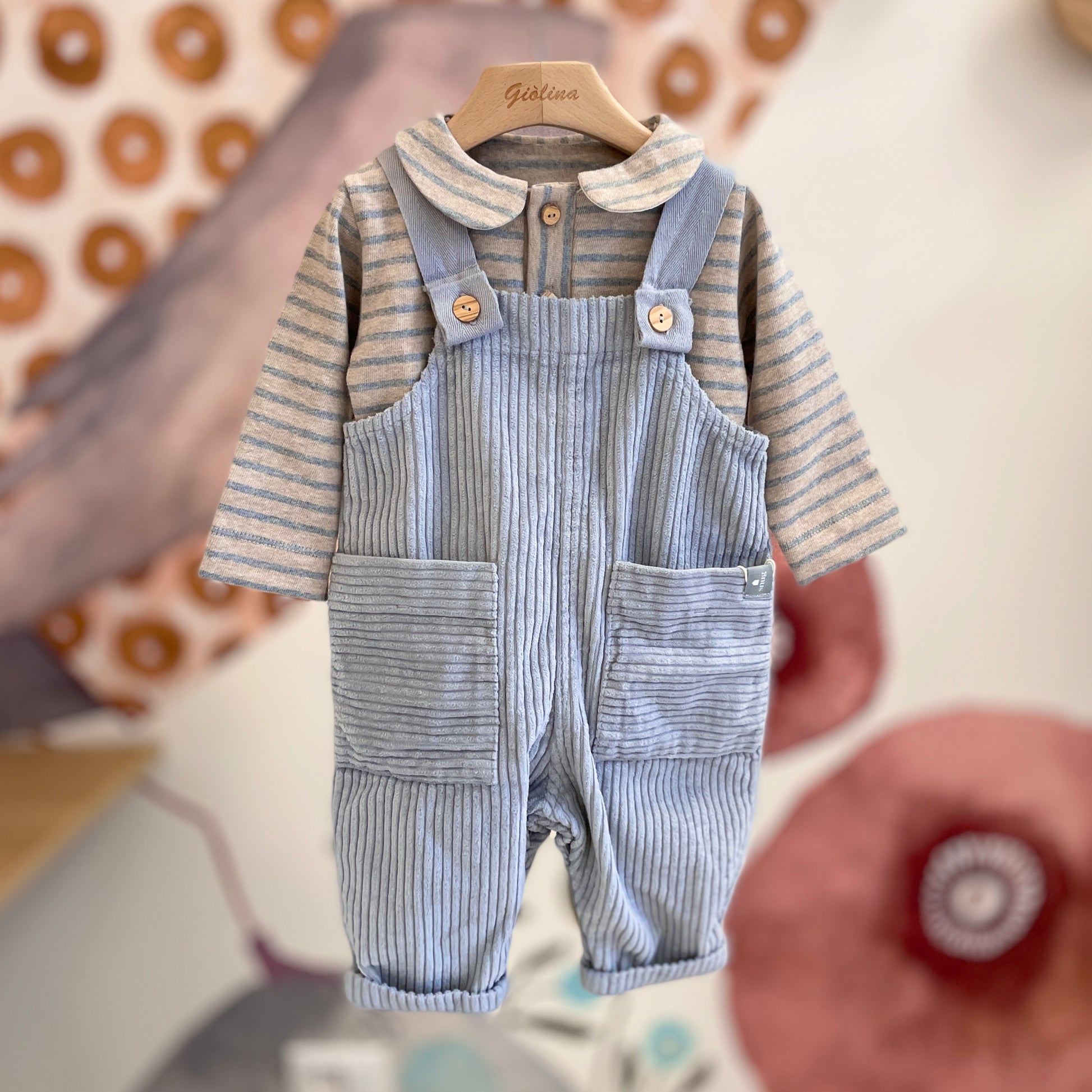 Salopette azzurro polvere in velluto a costa larga disponibile dalla 3 mesi alla 9 mesi . euro 59