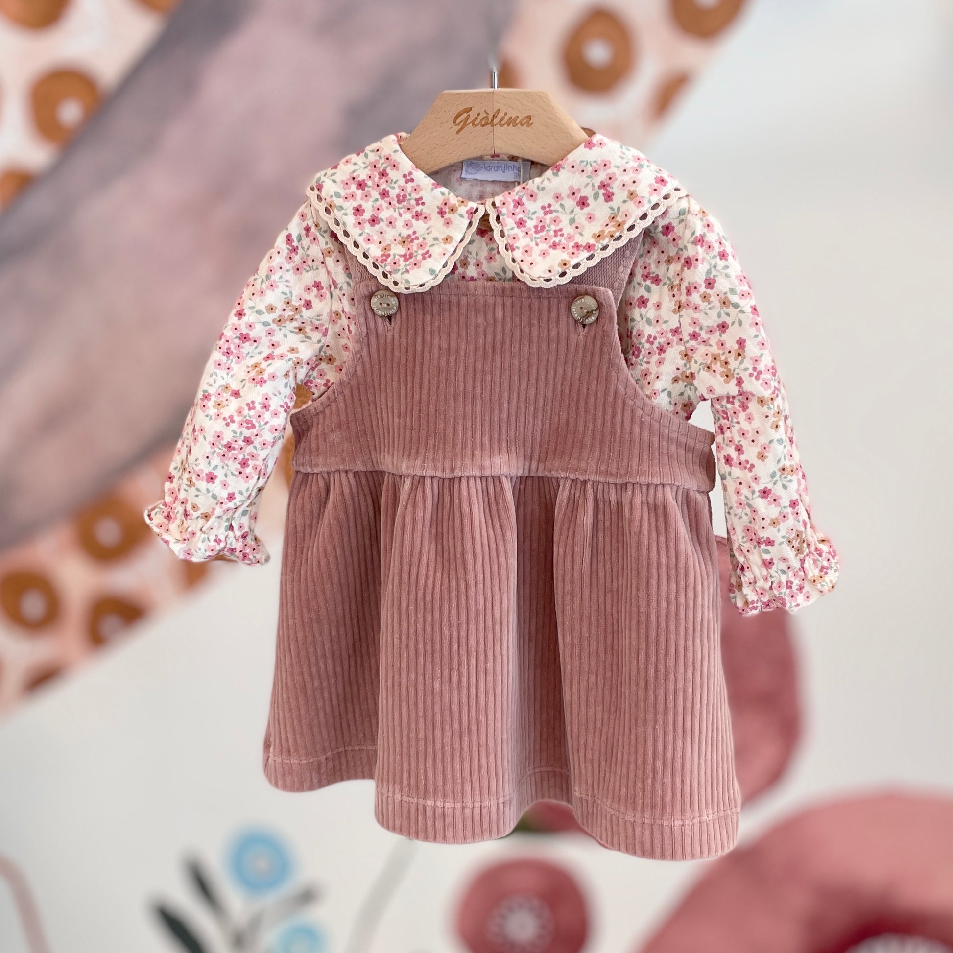 Salopette in velluto con gonna rosa antico disponibile dalla 3 mesi alla 3 anni . Da € 40 a € 44