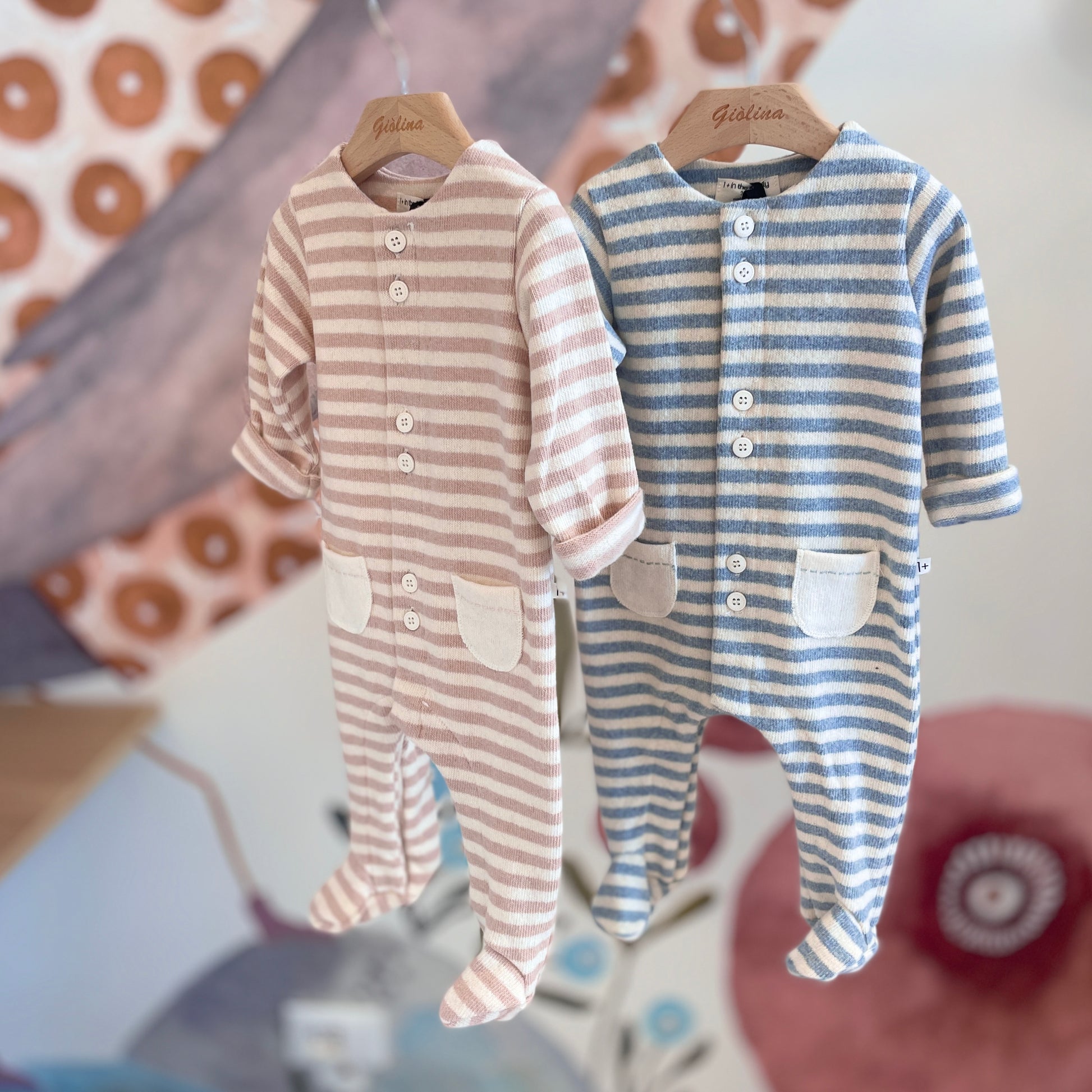 Tutine con bottoncini e piedini disponibili nelle variante rigate rosa e nuvola . € 65