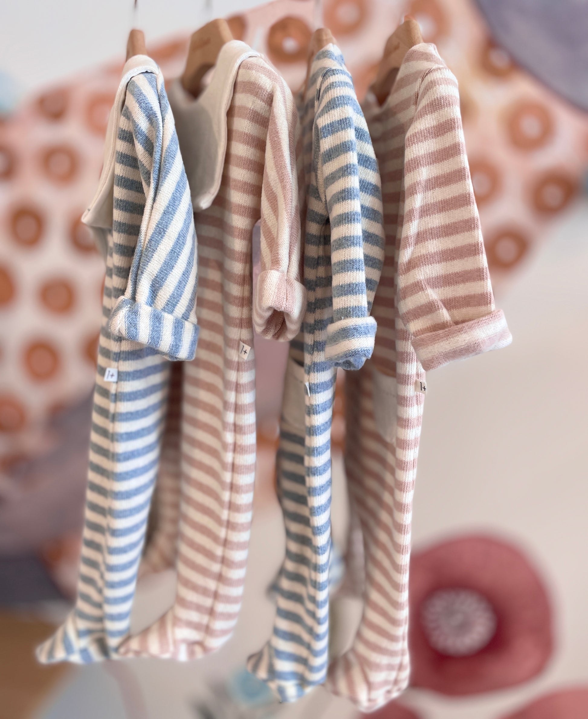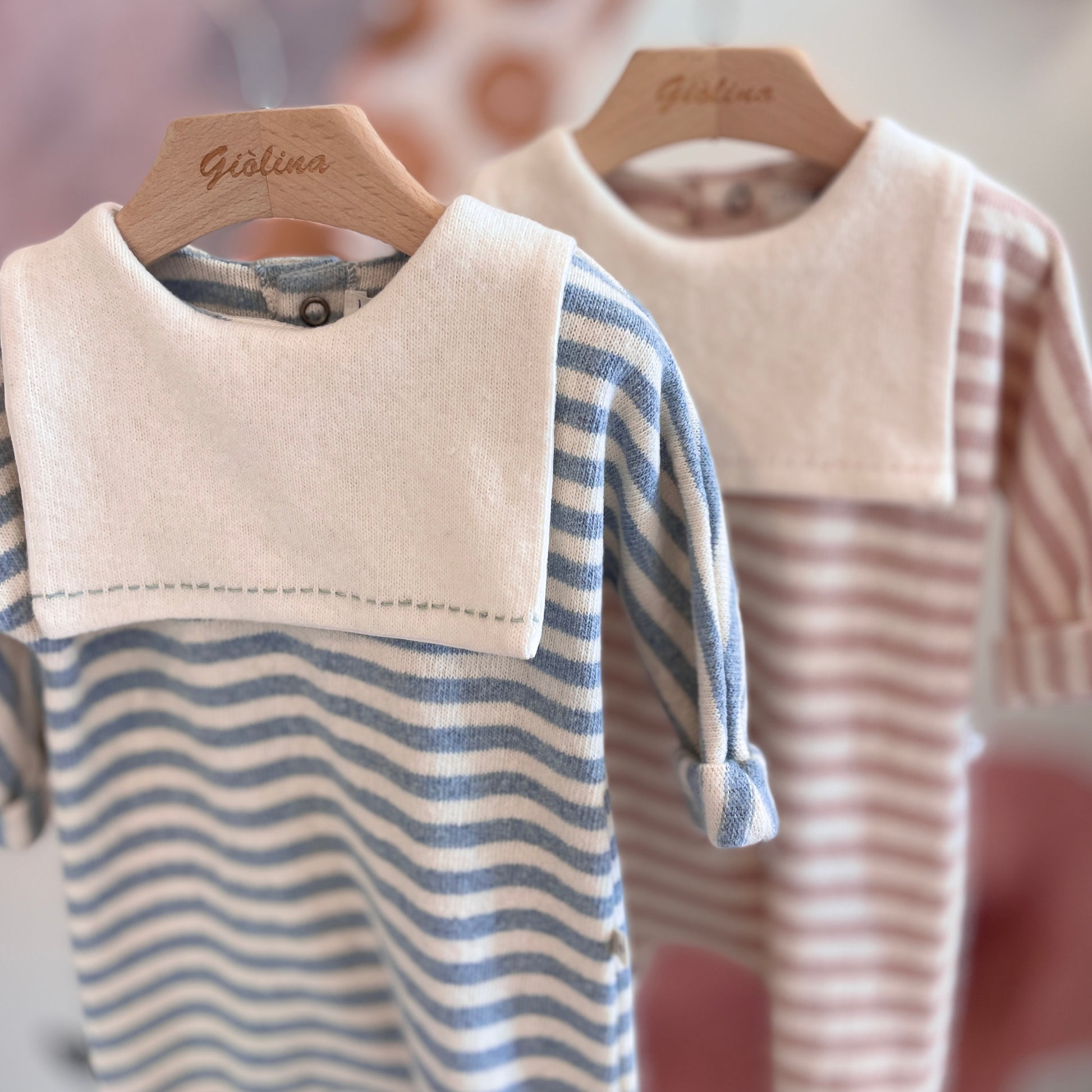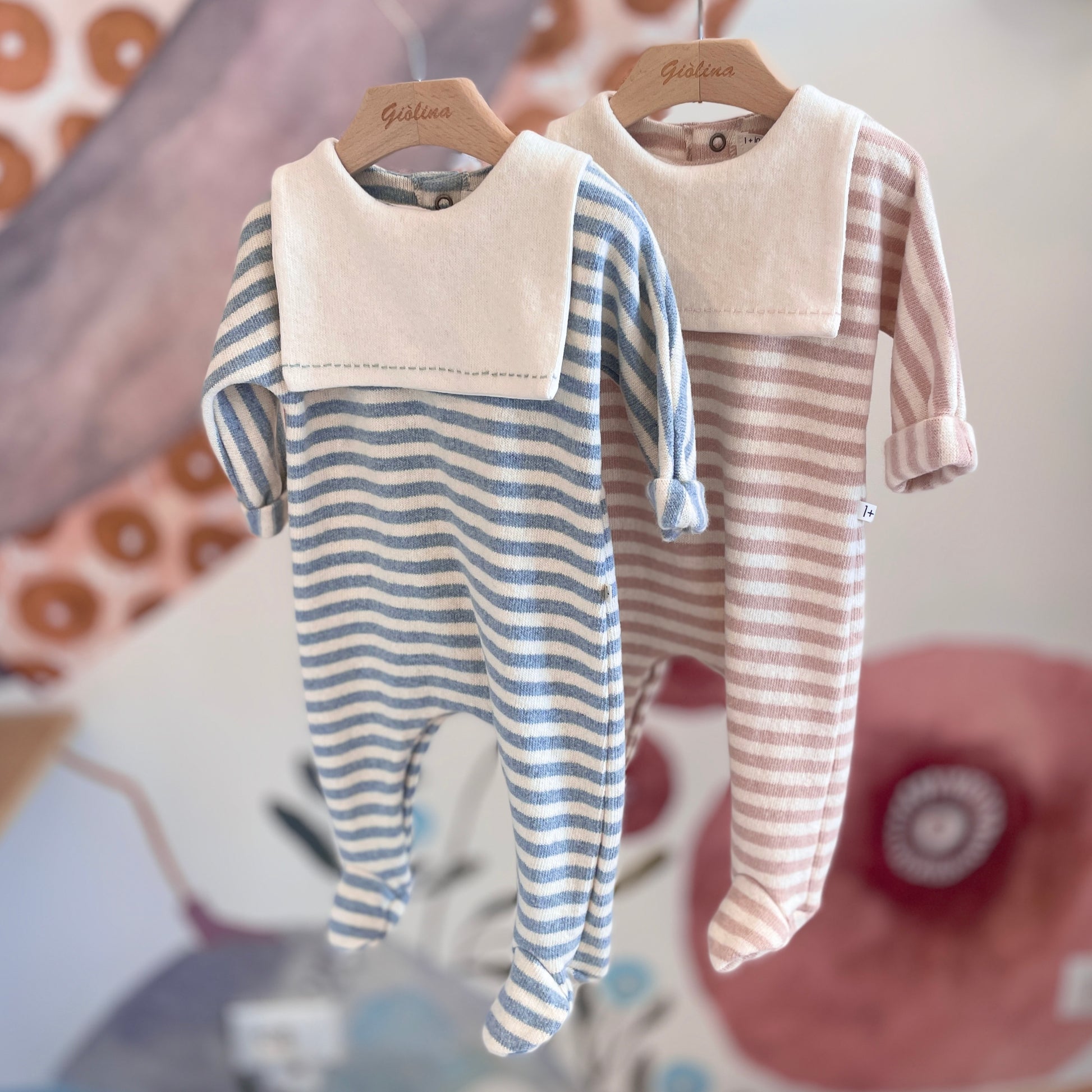 Tutine rigate con davantino disponibile dalla 1 mese alla 6 mesi . Con piedini e bottoncini automatici . Nella variante rigata nuvola e nude . € 73