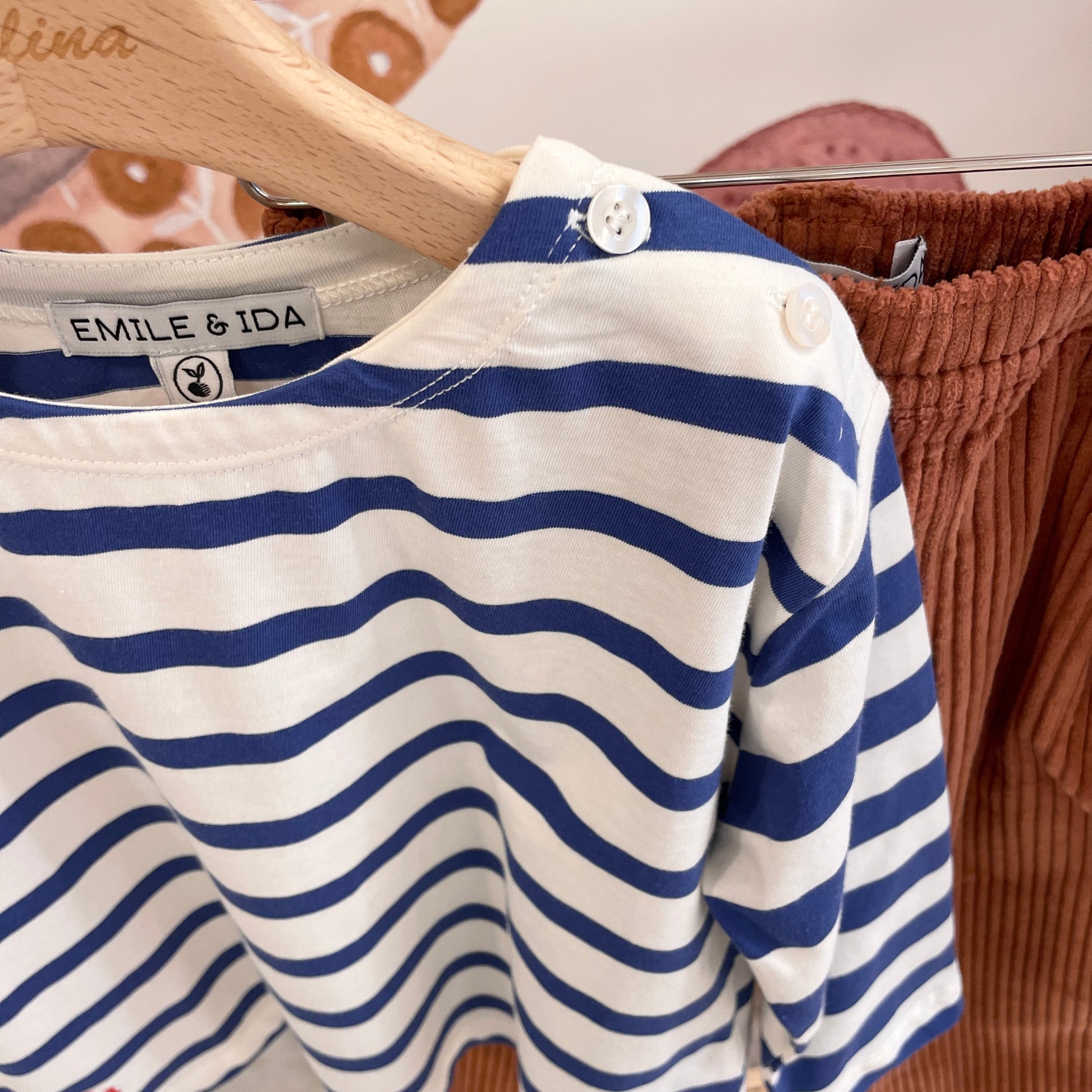T-shirt rigata bianca e blu girocollo disponibile dalla 4 anni alla 10 anni . Da € 55 a € 59